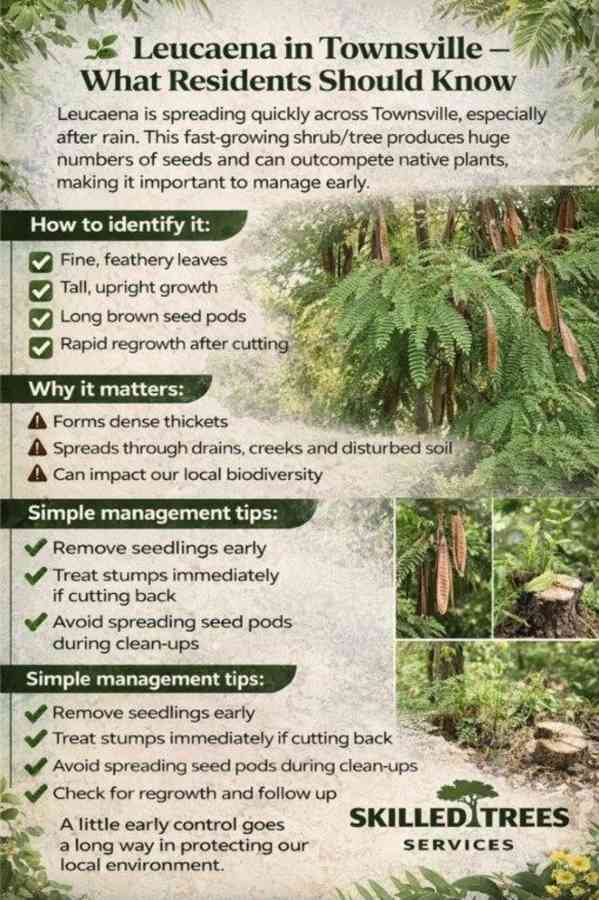 Leucaena is an invasive plant species that is spreading rapidly across Townsville, particularly following periods of rainfall. This fast-growing shrub and tree produces large quantities of seeds and can quickly outcompete native vegetation if left unmanaged.